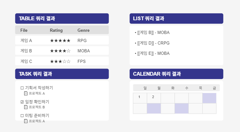 🔹 메타데이터 쿼리: 노트의 메타데이터를 기반으로 정보를 필터링하고 정렬 🔹 동적 테이블 생성: 쿼리 결과를 표, 목록, 작업 목록 등 다양한 형식으로 표시 🔹 자동 업데이트: 노트 내용이 변경되면 쿼리 결과가 자동으로 업데이트 🔹 JavaScript 확장: 더 복잡한 데이터 처리를 위한 JS API 제공