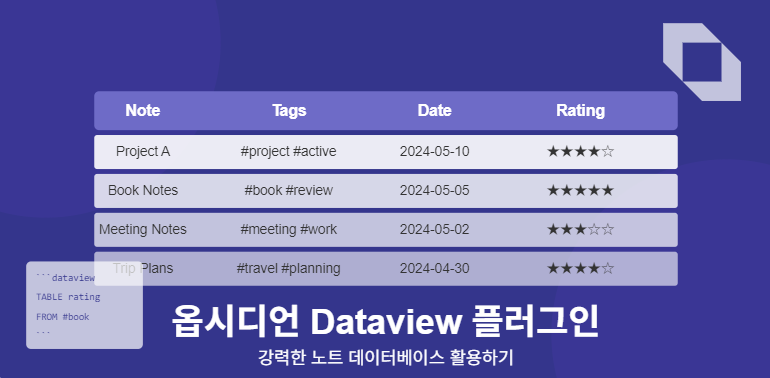 Dataview는 옵시디언의 강력한 플러그인으로, 노트 파일에 저장된 메타데이터를 기반으로 복잡한 쿼리를 실행할 수 있게 해줍니다. 이를 통해 노트 콜렉션을 데이터베이스처럼 검색하고 표시할 수 있습니다.
