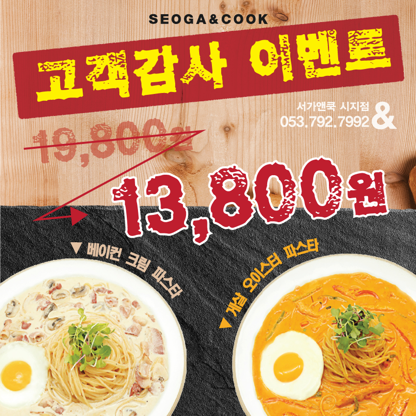 SEOGA&COOK 마케팅 소재는 고품질 음식 사진과 브랜딩 요소의 완벽한 조화를 이뤘습니다. 베이컨 크림 파스타와 계란 오이스터 파스타의 탄탄한 구성으로 메뉴의 프리미엄함을 효과적으로 어필했습니다.