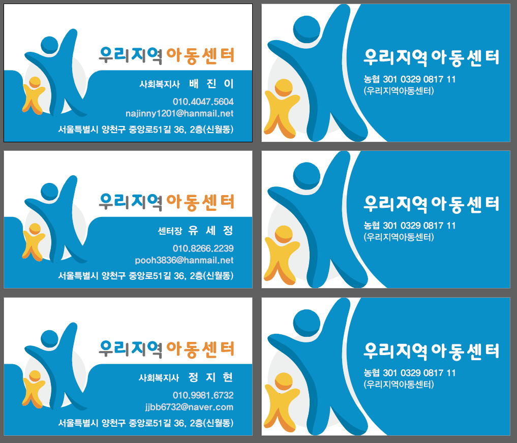 아동센터라는 곳의 특성상 학부모님들께도 신뢰감을 줘야 하고, 동시에 아이들이 봤을 때도 친근하고 따뜻한 느낌이어야 하잖아요. 게다가 사회복지사분들, 센터장님 등 여러 직책의 명함을 일관성 있게 만들어야 한다는 부담감도 있었구요.