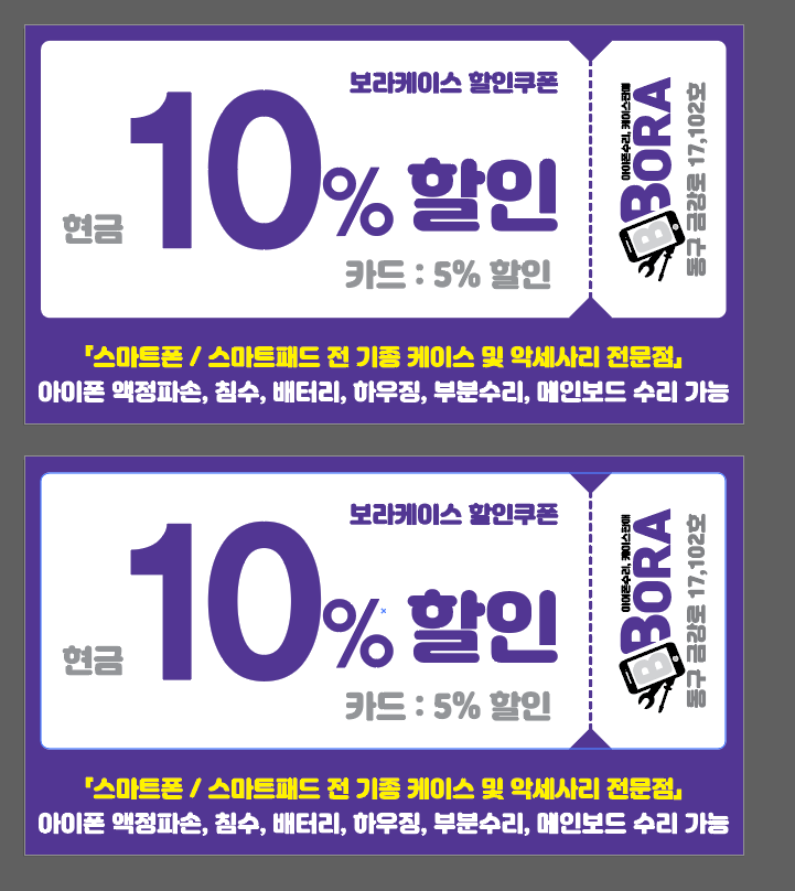 솔직히 처음엔 되게 부담스러웠어요. 보라케이스 대표님이 연락 주셨을 때, "로고부터 명함, 쿠폰까지 다 맡기고 싶다"고 하시더라고요. 스마트폰 수리점이면서 케이스도 판매하는 곳인데, 이 두 가지 느낌을 다 살려야 한다는 게 포인트였어요.