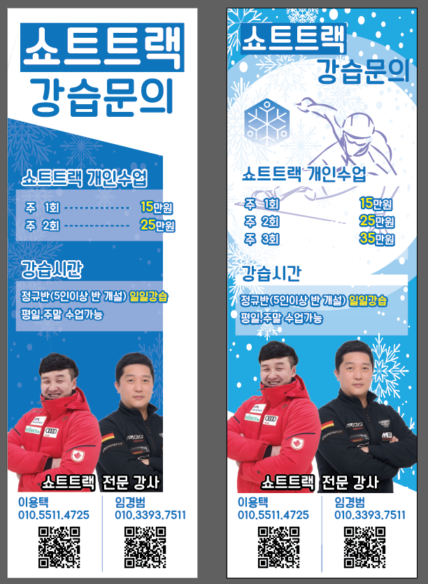 클라이언트분이 구미 아이스링크장에서 쇼트트랙 강습을 운영하시는데, X배너 2개랑 현수막 1개가 필요하다고 하시더라고요. 근데 처음엔 좀 막막했던 게, 강습 정보도 많고(가격, 시간, 강사님 정보 등) 이걸 어떻게 깔끔하게 정리하면서도 시각적으로 임팩트 있게 만들까... 고민이 많았어요.